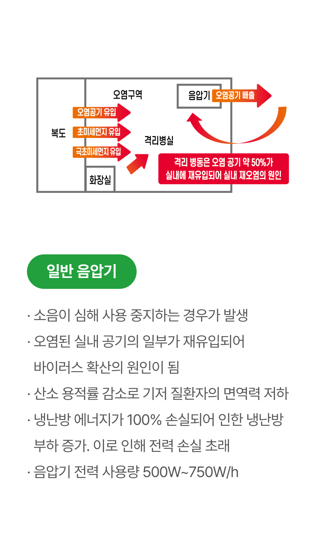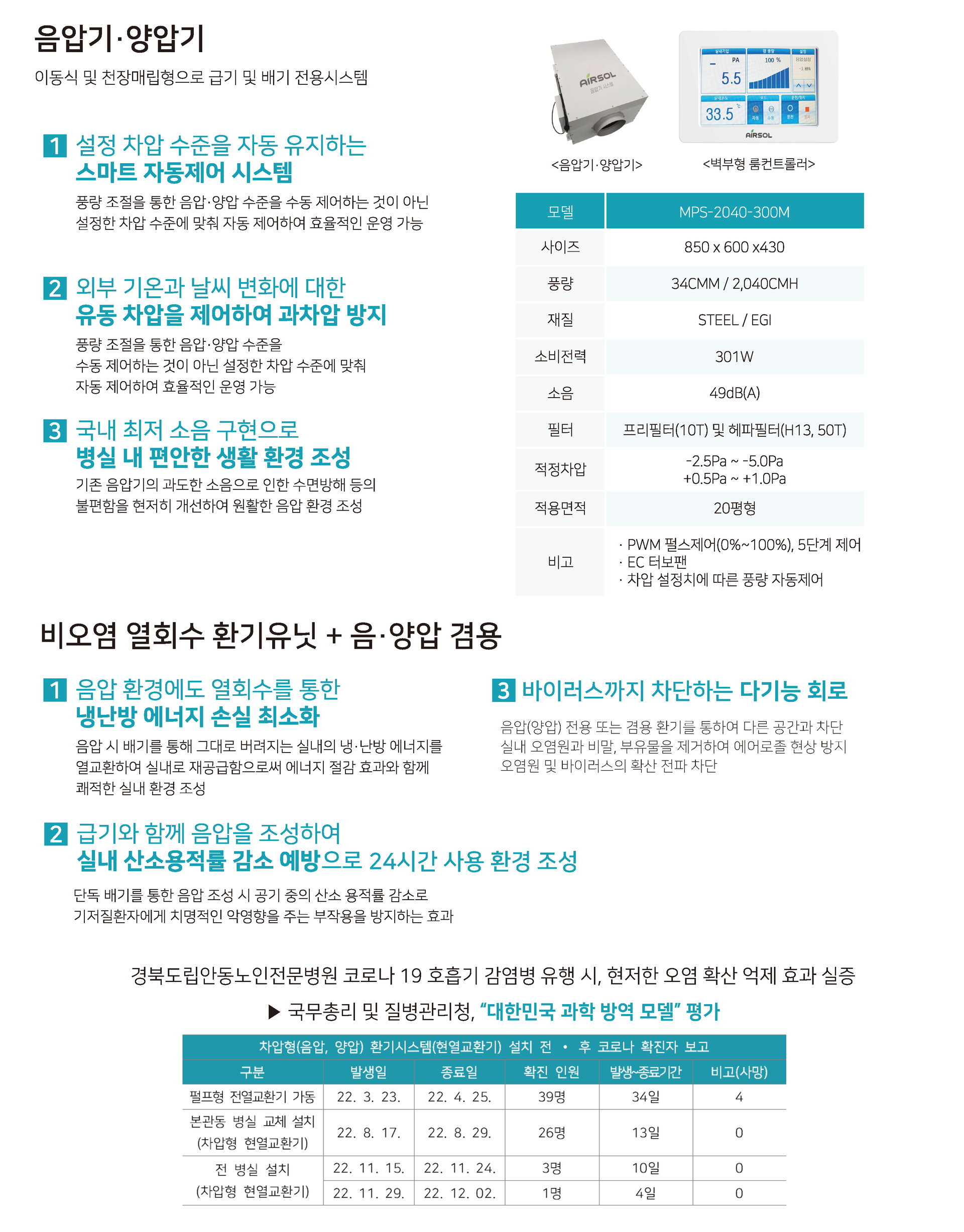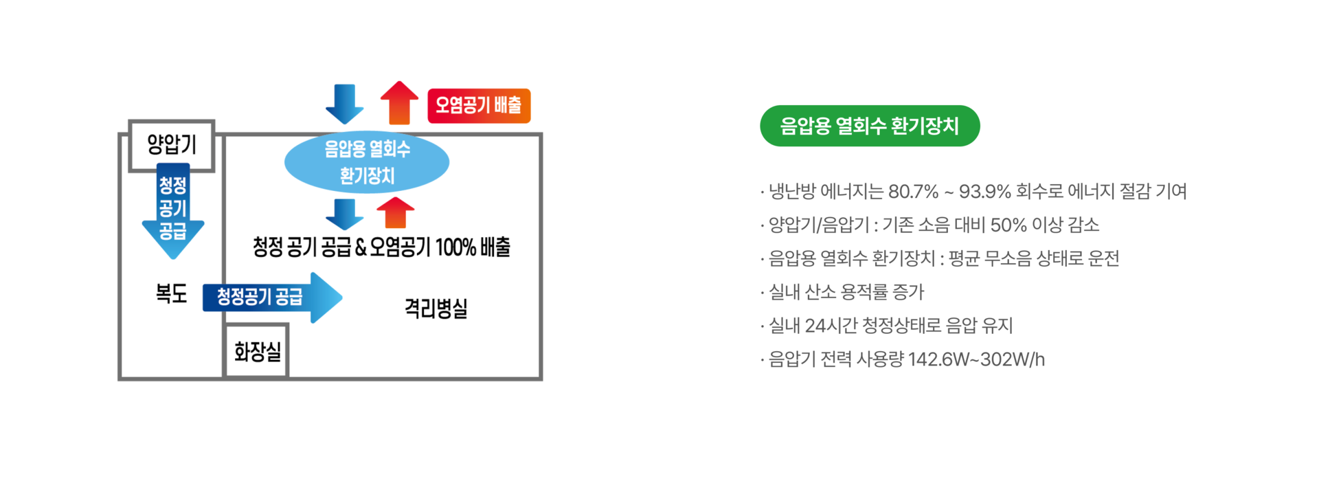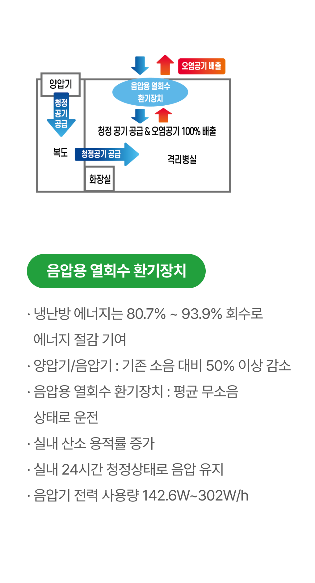 · 감염병 확산 시 실내 오염원을 제거 하기 위한 가변차압형 음압,양압기능과 인체의 산소포화도 감소 방지를 위한 음압 + 청정 환기 운전으로 환자의 생명을 보호합니다.