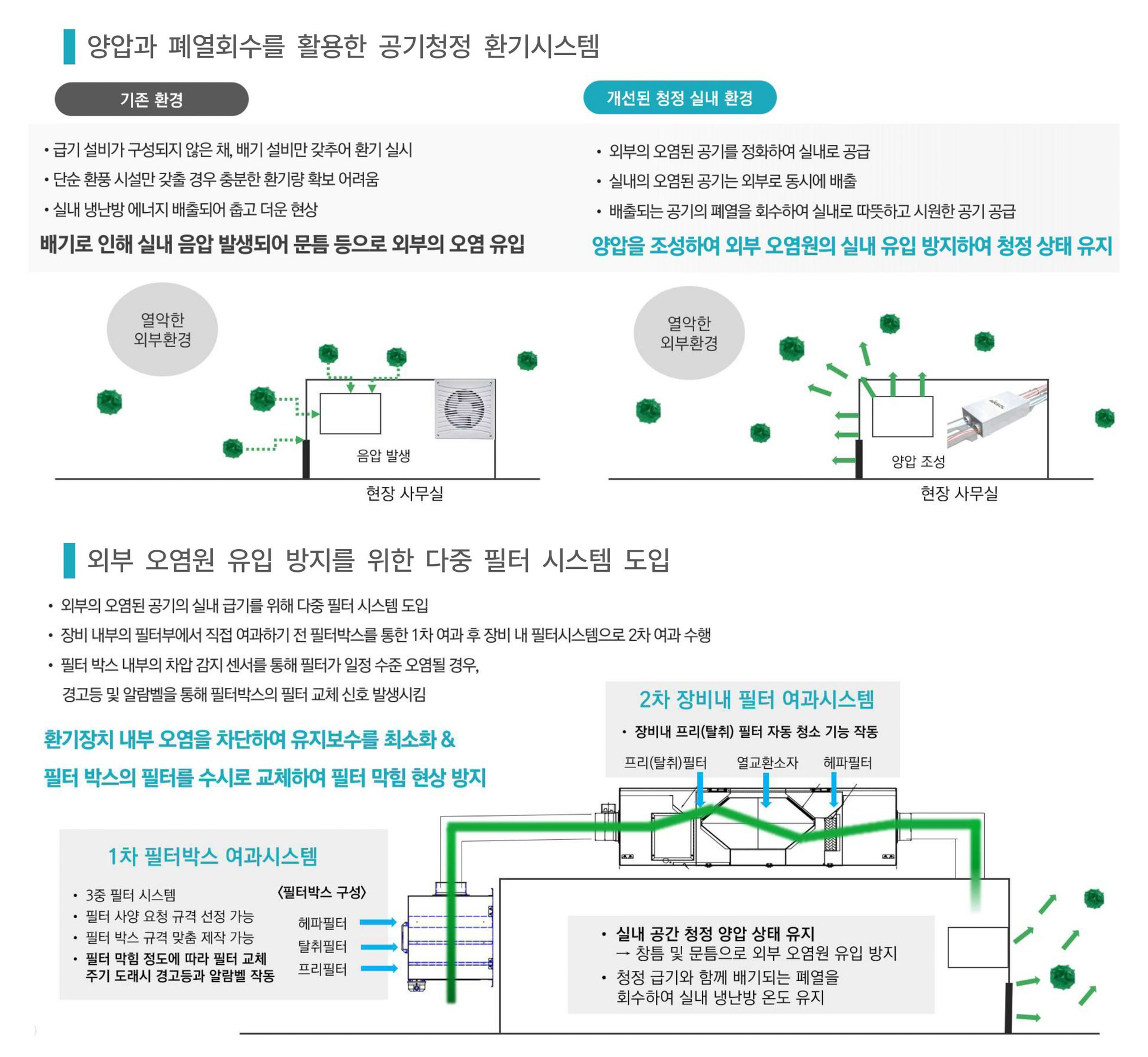 음압, 양압 및 열회수를 활용한 실내 공기정화